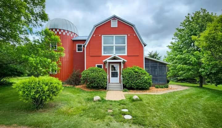 Hyggelig rød ladehytte med silo, naturskøn udsigt