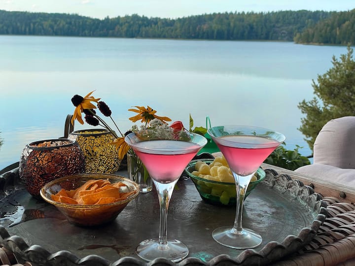 Hus ved søen med magisk udsigt, privat strand og sauna