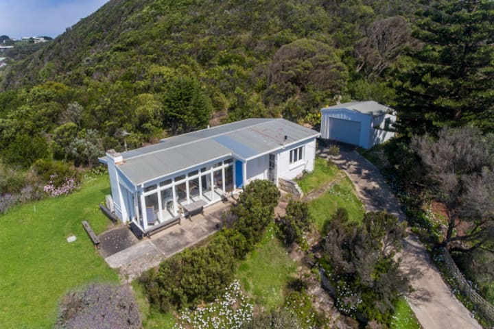Selvforsynende minihus, gårdmiljø, havudsigt.
