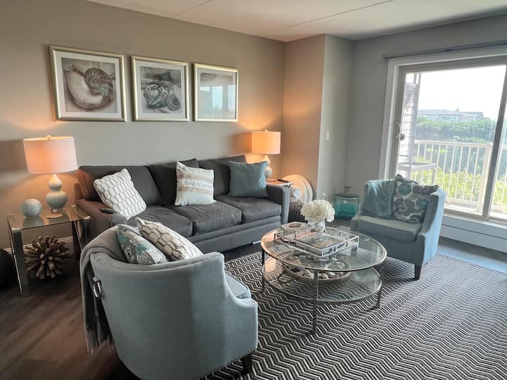 strandfront, havudsigt, flodmunding, hund, cykler, kajakker