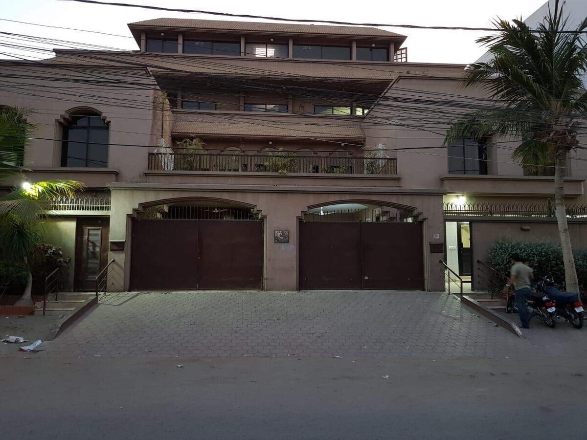 Velkommen til vores rummelige bolig på 200 kvm på første sal med 2 soveværelser med aircondition og tilhørende badeværelser, en hyggelig stue, en stue med spisebord og tv-væg, et fuldt udstyret køkken og en balkon med en fredfyldt udsigt. Beliggende i Gulshan-e-Iqbal Block 7, finder du fødevarekæder, parker, moskeer, supermarkeder, medicinske butikker og bagerier i nærheden. Døgnåben viceværtsservice sikrer et problemfrit ophold. Perfekt til familier eller forretningsrejsende. Med venlig hilsen Faisal Akhlaq
