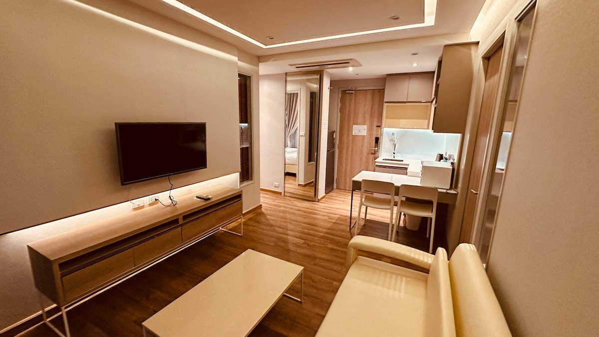 Lys og rummelig suite i Ao Nang | Kingsize-dobbeltseng | Lounge | Køkkenkrog Leder du efter komfort, plads og en perfekt beliggenhed i Ao Nang? Denne private suite på 45 m² med et soveværelse har alt, hvad du behøver til et afslappende ophold. Nyd en kingsize-seng med blødt sengetøj, privat stue med en sovesofa og smart-tv (med Netflix og Disney+), privat badeværelse og tekøkken – alt sammen inden for gåafstand til Ao Nang-stranden, butikker og restauranter. Bliver du 4 nætter eller mere? Så får du 2 GRATIS adgangskort til pool og fitnesscenter (1 km væk)