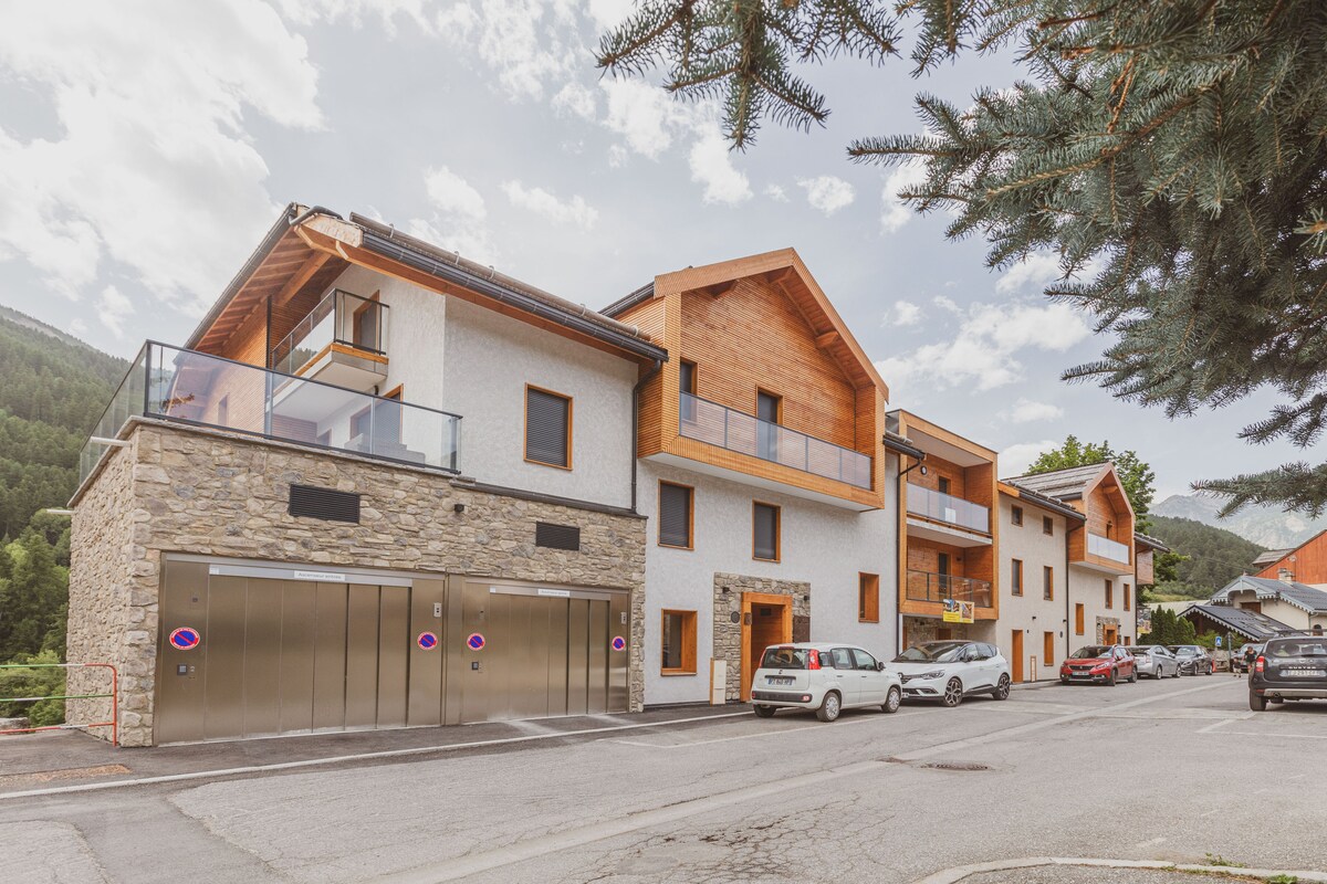 Luksuslejlighed i ny bolig Beliggende tæt på Serre Chevaliers skråninger, Chantemerle. Ideel til 4 personer, maksimum 5 Ideel og enestående beliggenhed kun 2 minutter fra pisterne, gondolen, shopping og alle faciliteter (apotek, medicinsk varighed...) mellem Briançon og Le Monetier Les Bains.
