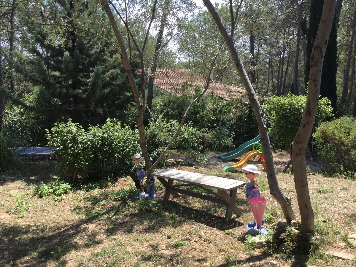 Boligby blandt fyrretræer og bagtorn, en oase af fred, absolut stilhed hele dagen, men ejendommen er ikke isoleret. Privat solterrasse uden overforliggende nabo, med havemøbler og parasol Og et afslapningsområde under et smukt oliventræ Adgang til ejendommen og det helt uafhængige studie. Vi accepterer ikke fester. Vi kender området godt nok til at kunne rådgive dig om vandreture, løb, cykling eller mountainbike.