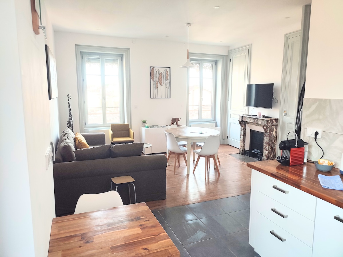 Denne rummelige 100 m² store lejlighed i to etager, der ligger i hjertet af Trévoux, er ideel til familier, venner eller forretningsophold og kombinerer gammeldags charme og moderne komfort. Nyd et fuldt udstyret køkken, en stor, hyggelig stue og to suiter med aircondition, hver med eget badeværelse og toilet – perfekt til at bevare alles privatliv. 🧑💻 Komfortabelt fjernarbejde (tilpassede rum, stille) 🚴 Cykelvenligt – Voie Bleue er et stenkast væk 📍 Hurtig adgang til Lyon/Villefranche, A6, A89 og A46