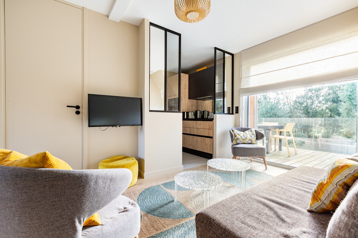 Studio med egen indgang, i en charmerende og "hyggelig" atmosfære med udsigt over terrassen og haven. Beliggende i et roligt, fredeligt, grønt og træbevokset område. I centrum af badebyen Hardelot. Meget godt solskin (syd/vest). Terrassen er til rådighed for gæsterne. I nærheden af butikker, restauranter, hav, skov, klitter, golf, ridecenter, tennis, cykelstier. I nærheden af en ladestation til elbiler.