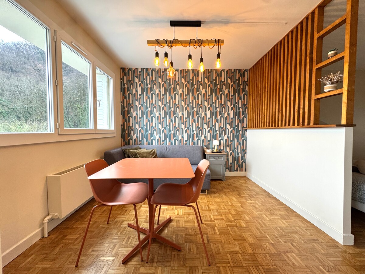 Velkommen til min fuldstændigt renoverede 38 m2 lejlighed på 5. sal med elevator i en lukket lejlighed med port og parkering. Stue med tv, udstyret køkken (opvaskemaskine, vaskemaskine, kaffe), soveværelse med hotelseng, badeværelse med toilet, fiber 5 minutter fra togstation og sporvogn, 15 minutter fra Uriage og dens termiske kure, 30 minutter fra Chamrousse, 10 minutter fra Grenoble og 10 minutter fra campus Alle butikker 2 minutters gang Sengetøj og håndklæder er inkluderet i lejen
