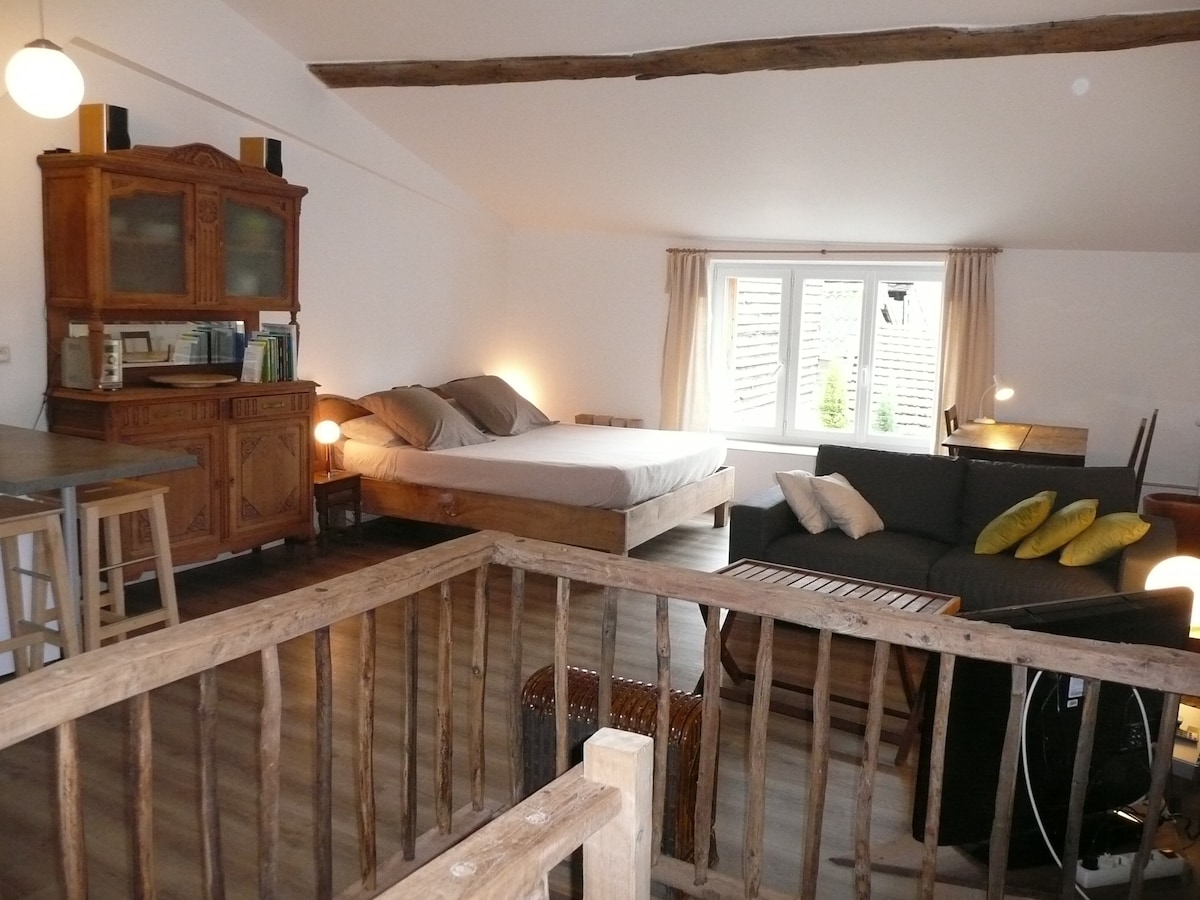 Hus i bunden af haven, brusebad 20 meter væk og uafhængigt af hovedhuset. Dobbeltsengen er på mezzaninen, adgang til stigen, den er 160 x 200 cm, og der er en sofa til en 3. person. Køkken: køleskab, lille fryser ovenfor (Picard ligger 50 m gang fra huset), Tassimo kaffemaskine, brødrister, kedel, mikrobølgeovn/grill. Der er ingen vandhane eller kogeplade. Jeg stiller vandflasker til rådighed