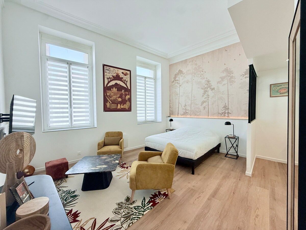 2-værelses lejlighed i duplex på 44m² i centrum af Rochefort. UNIK: Spisestuen er placeret i et dobbelt glasrum med panoramaudsigt KOMFORT: Soveværelset har kvalitetssengetøj og en seng 160x200 LYS: Vend mod syd og sydvest BELIGGENHED: I centrum af Rochefort og overfor en gratis parkeringsplads med 1000 pladser ROLIG: Vinduerne i stuen og soveværelset vender ud mod den indre gårdhave