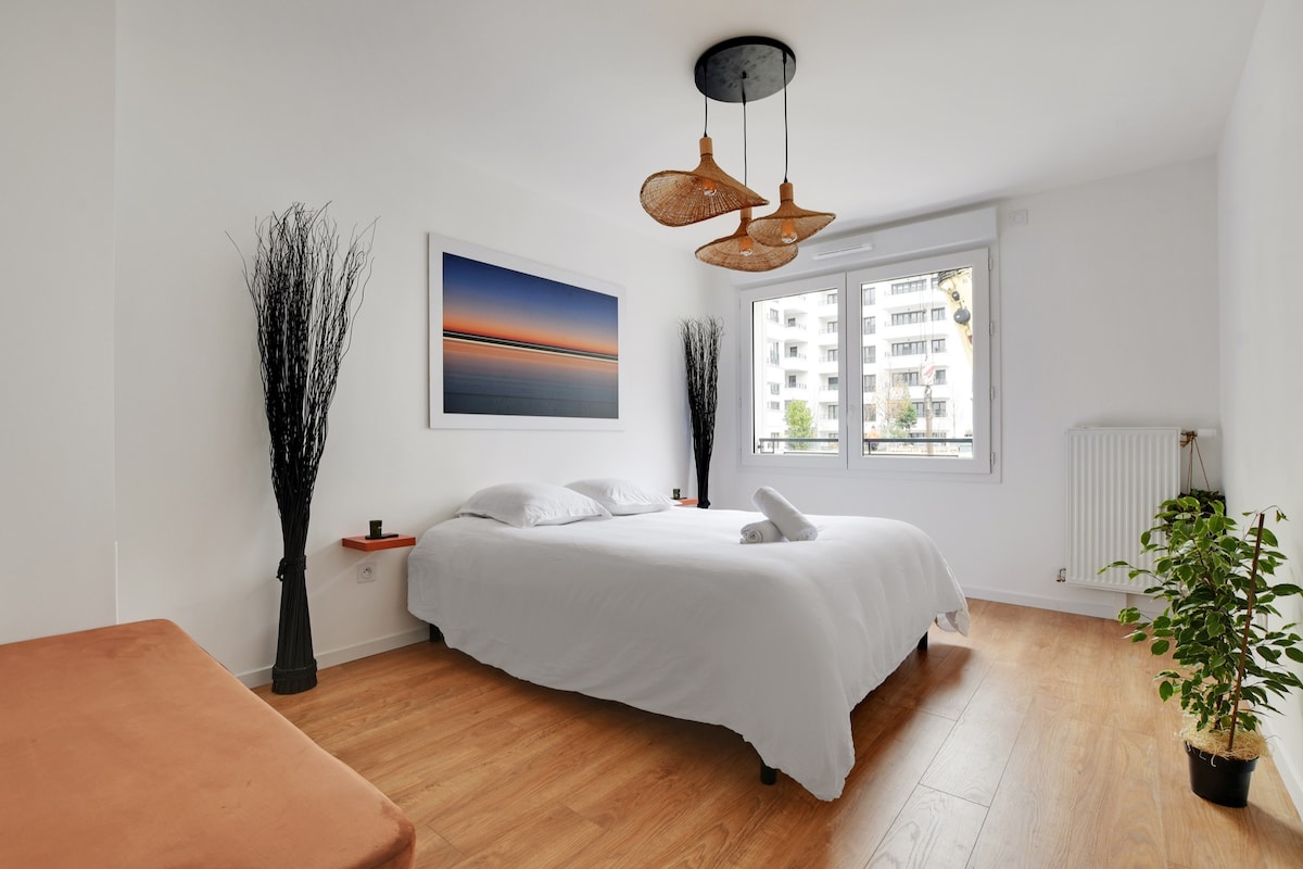 Kom og læg dine kufferter i denne smukke, rolige, indbydende og meget velbetjente lejlighed. Den er ny, fuldt udstyret, komfortabel og lys, med en stor blomsterterrasse og en balkon. Beliggende ved metro 14 og tæt på metro 13, vil du være 20 minutter fra Châtelet, 25 minutter fra Stade de France og 30 minutter fra Eiffeltårnet. Der er en dobbeltseng i det første soveværelse, en sovesofa i det andet og en anden sovesofa i stuen.