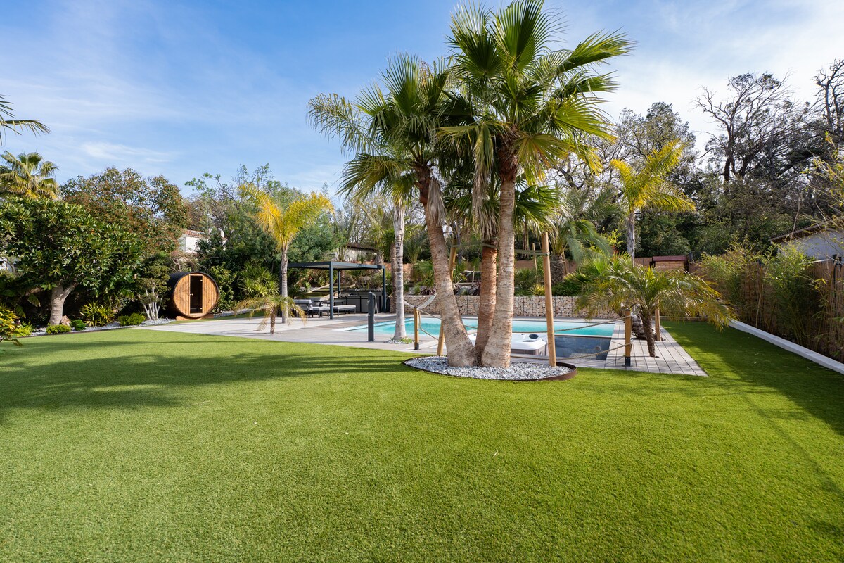 Denne udlejningsbolig er ideel til familie eller vennegrupper og tilbyder en 2-værelses lejlighed, der er fuldt udstyret til fire personer. Gæsterne vil nyde en have på 1300m² udelukkende til gæster, med swimmingpool, jacuzzi, sauna, putting green, tennisbane, legeplads, udendørs køkken og gratis parkering. Roligt beliggende, omgivet af grønne områder, ti minutters gang fra det historiske centrum, fem minutters kørsel fra stranden, mellem Saint-Tropez og Cannes. Ideelt sted til din ferie! Kæledyr er velkomne!