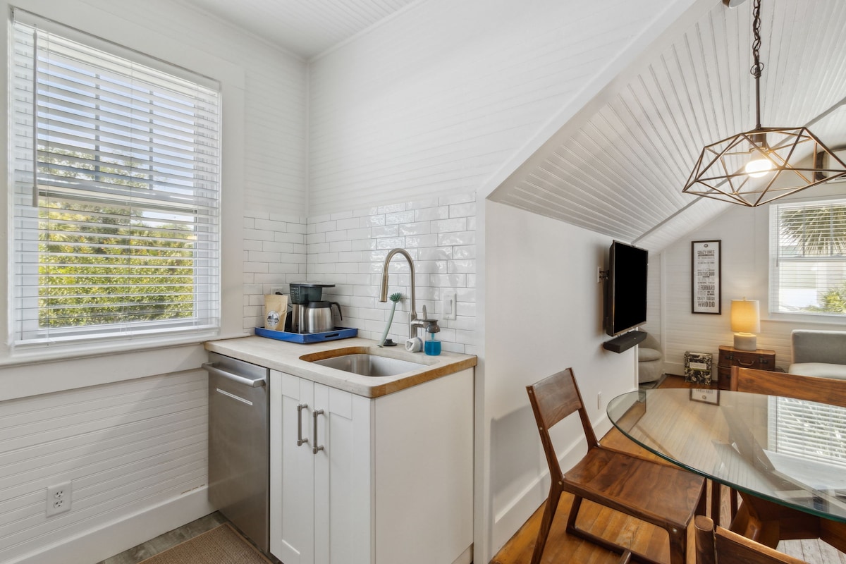 Din perfekte ferie, kun 30 sekunder fra stranden! Denne lejlighed med 1 seng/1 badeværelse blander historisk charme med moderne bekvemmeligheder. Nyd en kort gåtur til stranden, 5 minutters gang til King & Prince Hotel og 10 minutters gang til Pier Village. Vi leverer sengetøj, håndklæder og køkkenudstyr af høj kvalitet. Oplev ultimativ komfort og et uforglemmeligt 5-stjernet ophold med gennemtænkte faciliteter og personlige detaljer overalt.