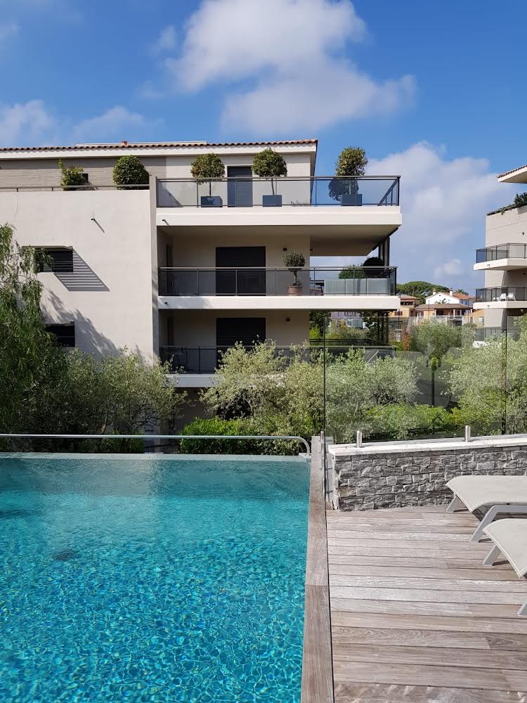 "ANTIBES LES PINS RESIDENCE" -2 BR MED 3 TERRASSEER-HAVFRONT-SIDSTE ETAGE-EXPO ØST/SYD/VEST... Lejlighed med havudsigt beliggende på øverste etage i en luksusbolig lige over EXFLORA Park. Direkte adgang til stranden (100 m) - Ingen vej at krydse. Sikker infinity-pool med vandfald og solarium samt en soppepool og sanitært område: Åben hele året og overvåget i juli og august. Adgang for bevægelseshæmmede (adgang til kælder, lejlighed, swimmingpool og strand).
