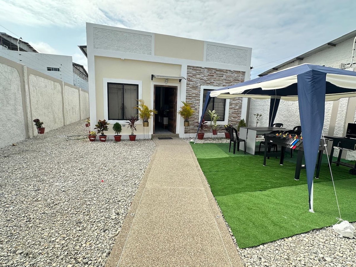Moderne finish. Beliggende på en hovedgade (i retning af Banco Pichincha y Muelle) tæt på havet( 4 blokke), tæt på markedet (2 blokke). -Amoble - Klimaanlæg i alle rum , - Wi-fi-område (3 netværk for bedre forbindelse) - Rummelig lejlighed med privat pool og boblebad med farverige LED-lys og livlige små sociale sammenkomster - 3 hængekøjer - Grillområde,(grill) - Garage - Garage til 2-3 biler - Ekstra gæst annullerer separat