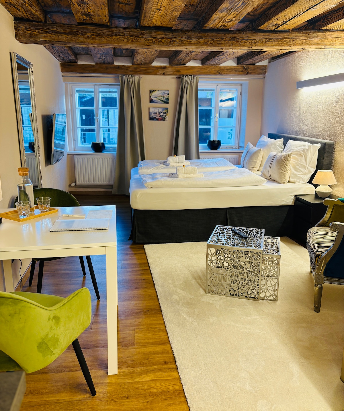 Elegant og åbent, vores værelse tilbyder 22 kvadratmeter komfort, komplet med en dobbeltseng, et tv, en kaffemaskine, et lille skrivebord og et dejligt mørkt flisebelagt badeværelse (med brusekabine!). Med en charmerende pastelfalet og varm belysning er rummet perfekt til to gæster, der tilbyder alt, hvad du har brug for til at slappe af i Østrigs mest musikalske by. Og fordi vi bekymrer os lige så meget om verden som vores gæster, er al vores opvarmning bæredygtig!