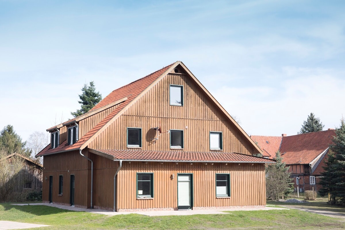 Vores ferielejlighed ligger i stueetagen i en stor bondegård, lige ved Drömling, det unikke biosfærereservat. Den har en separat indgang. Parkeringspladser med mulighed for at oplade elbilen lige foran huset. Gårdens grund er helt indhegnet og derfor ideel til børn. Gyngen, sandkassen og pælehuset må gerne bruges, så vores hund, katte, kyllinger og ponyer hurtigt bliver en bagtank. Du er velkommen til at bruge poolen.