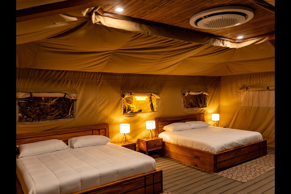 Oplev den perfekte blanding af natur og luksus i vores smukt designede glampingtelt. Med to queensize-senge og en udtræksseng har dette rummelige tilflugtssted komfortabelt op til fem gæster, hvilket gør det ideelt til familier, venner eller par, der søger en unik smuttur. Omgivet af betagende landskaber tilbyder denne glampingoplevelse charmen ved udendørsliv med komforten af moderne faciliteter.