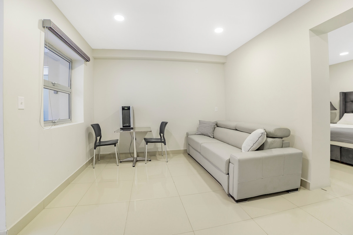 For nylig ombygget Studio 350 kvadratfod / 33 m2 til 3 gæster. Beliggende i Tijuana en blok væk PedWest Customs & Border / 10 min gang væk PedEast. Studiet ligger på anden sal i en bygning med en middelhavsinspireret moderne elegant stil. Stille, fuldt møbleret tæt på caféer og barer og kort køretur til supermarkeder.
