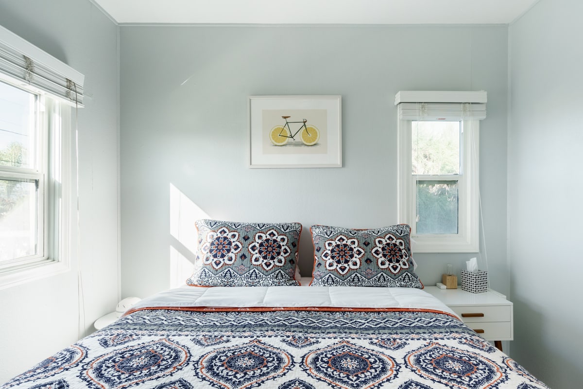 Det ene soveværelse, den ene badeværelsesenhed blev for nylig ombygget (i 2017) og omfatter alt nyt køkken, badeværelse, fuld størrelse vaskeri og aircondition. Den store 400 kvadratmeter private terrasse har nye udendørsmøbler med udsigt til Mission Bay og smukke solnedgange året rundt. Nyd et show på 50" 4K LG smart-tv i stuen, som tilbyder Netflix, Amazon Video og store netværkstv-stationer. Tilbered et lækkert måltid i tekøkkenet med minikøleskab/fryser, mikrobølgeovn, elkomfur, kaffemaskine med mere. Hvis du planlægger at tage til stranden, er opbevaringsottomanen i al hemmelighed en "strandkasse", der indeholder et par klapstole, strandlegetøj, håndklæder og en lille køler. Boligen er fyldt med kaffe, shampoo, balsam, vaskemiddel, strygejern og meget mere. Filtreret vand leveres via en hane på køkkenvasken. Nem indtjekning via et numerisk tastatur på hoveddøren med koden, der er angivet inden ankomst. Der er masser af gadeparkering. Vi elsker at møde nye mennesker og bor ved siden af i hovedhuset, så vi er tilgængelige det meste af tiden. Vi er begge fra San Diego og elsker stadig at udforske de seneste nye steder, så vi giver gerne anbefalinger. Bay Park er et fantastisk centralt kvarter, der oprindeligt blev bygget i begyndelsen af 1940'erne. Det blev for nylig kåret som det mest beboelige kvarter i en nylig San Diego-afstemning. Tjek restauranterne på Morena Boulevard, som ligger kun få minutters gang væk, eller udforsk nemt alle de store attraktioner i San Diego. Huset har nem adgang til I-5 og ligger kun 10-15 minutter fra centrum, Sea World, San Diego Zoo og lufthavnen. Det private gæstehus ligger over for Mission Bay og inden for gåafstand til bugten, markedet, restauranter og kaffebarer. Uber/Lyft koster 8-14 dollars til de fleste af San Diegos største seværdigheder. Der er lidt hvid støj fra motorvejen nede ad bakken nær Mission Bay, når man er ude på terrassen, men ikke noget for slemt, bare værd at nævne. Enheden har dobbeltpansrede vinylvinduer, så det er stille indendørs.