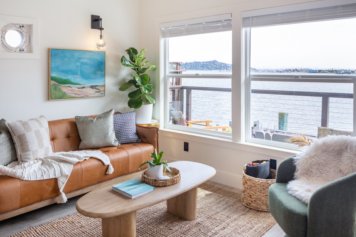 Nestled on the water of the Sausalito Richardson Bay, our houseboat offers an immersive experience of unrivaled beauty. The breathtaking, panoramic views unfold like a canvas right before you. Upper level of remodeled houseboat with rooftop deck, full kitchen and laundry where every detail is thoughtfully designed including local artists' work. Staying here is not just about accommodation; it’s creating memories that will linger long after you’ve departed. Not suitable for young children/pets.