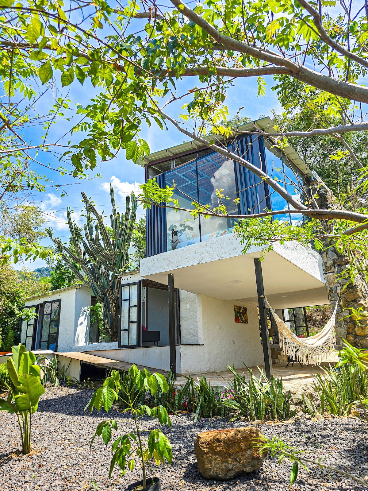 Nyd roen og charmen i Barichara i vores smukke hytte, der er ideel til længerevarende ophold. Ejendommen er fuldt udstyret med alt, hvad du behøver for et behageligt og afslappende ophold. Med rolige områder, masser af naturligt lys og et hyggeligt design. Værelse med dobbeltseng, garderobe og sengeborde, med balkon. Fuldt udstyret køkken med moderne apparater. Wi-fi og arbejdsområde med STARLINK-internet til digitale nomader. Badeværelser med varmt vand.