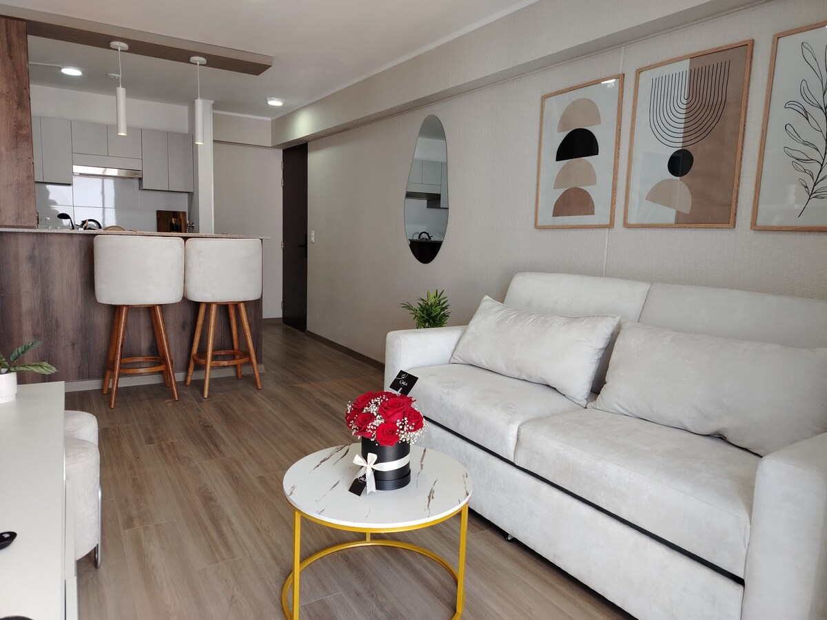 Vive la experiencia de Miraflores en un espacio moderno y acogedor Disfruta de una estancia inigualable en este elegante apartamento ubicado en el corazón de Miraflores. Con un diseño moderno y detalles cuidadosamente seleccionados, es el lugar ideal tanto para el descanso como para el trabajo. A solo unos pasos, encontrarás las mejores cafeterías, restaurantes, centros comerciales y el hermoso Malecón, perfecto para paseos con vista al mar.