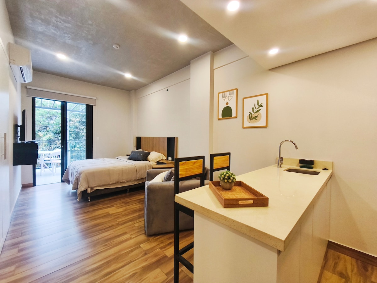 1-værelses lejlighed i en ny bygning designet til kortvarige ophold. Beliggende i et førsteklasses område i Asunción, kun 250 meter fra Shopping del Sol og 600 meter fra Paseo La Galería. Faciliteterne omfatter en tagterrasse med pool, fitnesscenter, biograf, kontorfællesskab og grillområder. Inkluderer balkon og døgnåben reception.