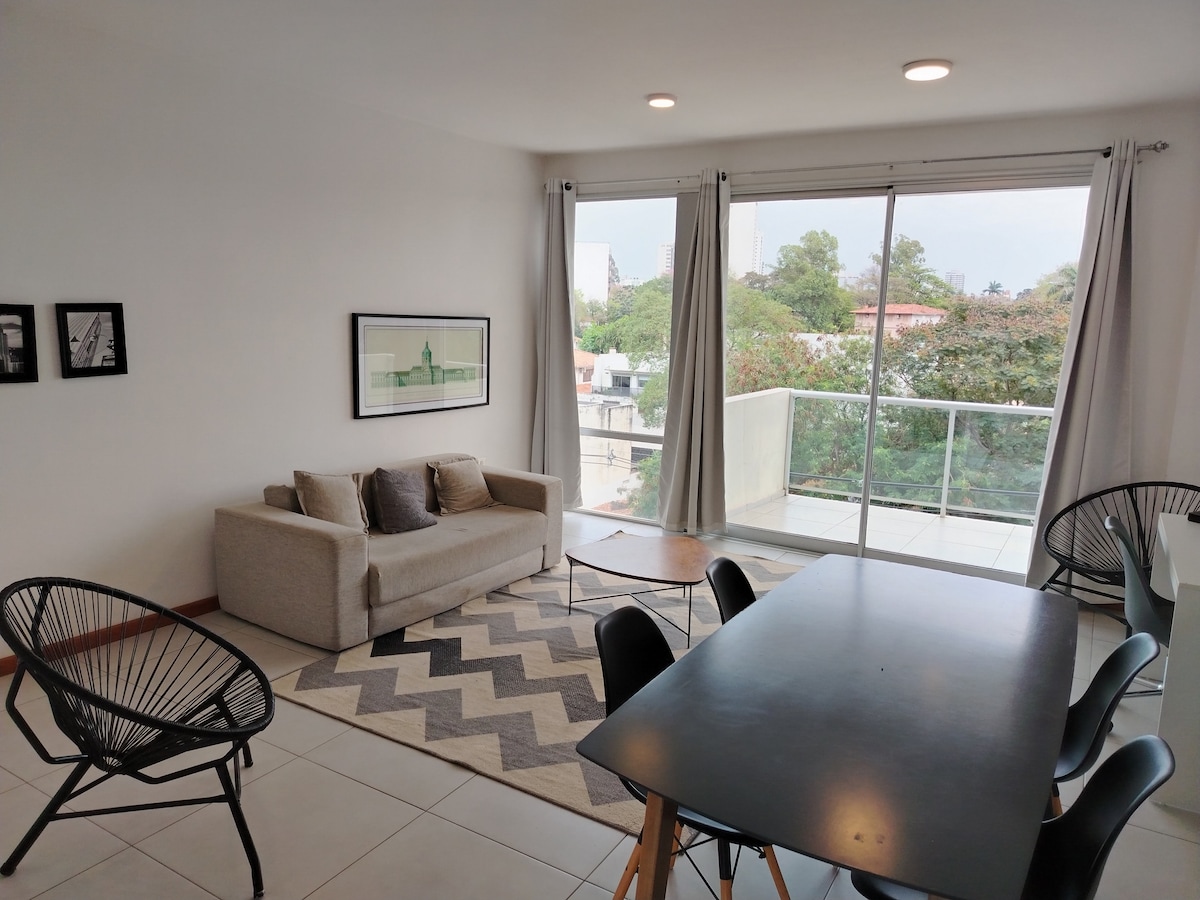 1-værelses lejlighed i en ny bygning designet til kortvarige ophold. Beliggende i et førsteklasses område i Asunción, kun 250 meter fra Shopping del Sol og 600 meter fra Paseo La Galería. Faciliteterne omfatter en tagterrasse med pool, fitnesscenter, biograf, kontorfællesskab og grillområder. Inkluderer balkon og døgnåben reception.