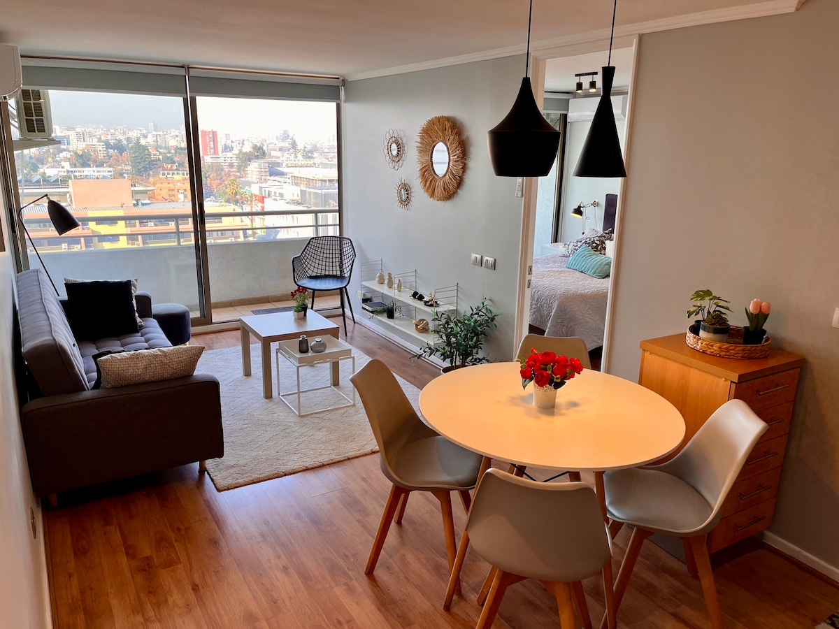Hyggelig lejlighed foran Irarrázaval-metroen, ideel til arbejde eller hvile. Hurtig wi-fi, skrivebord, aircondition og varme. Smuk udsigt over Santiago. Omfatter faciliteter som te, kaffe med mere. Sommerpool og fitnesscenter. Bip-kort til at komme rundt med metroen. Råd om gåture. Tæt på Barrio Italia, supermarkeder, apoteker og fastfood såsom pizza og Subway. Parkering på anmodning.