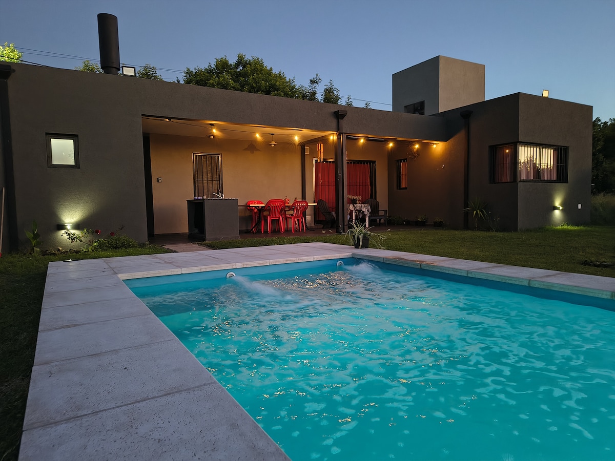 Beliggende i et lukket kvarter - Estancia La Rinconada. Komfortabelt, rummeligt og lyst hus. Privat pool. Grill og overdækket galleri. Overdækket garage til to køretøjer. Wi-fi. Køkken med udstyr. Alle værelser har aircondition og ventilator. 3 soveværelser. Et i stueetagen med eget badeværelse. Ideel til afslapning, til golfgrupper og/eller familier. Sikkerhed 24 timer i døgnet. Privat alarm. 10 minutter fra Rosario. Fester er ikke tilladt.