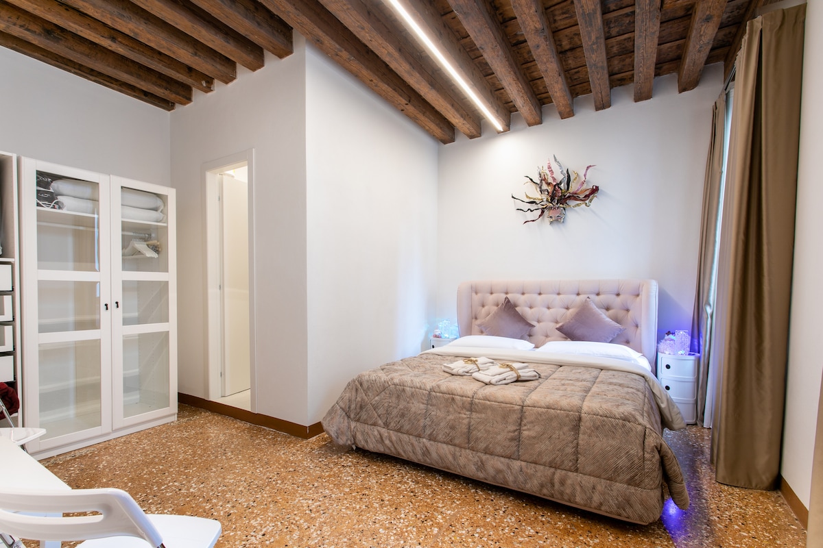 Denne elegante og unikke lejlighed er perfekt til et par, der ønsker at nyde romantikken i Venedig. En privat terrasse på vandet giver mulighed for romantiske morgenmåltider eller middage med levende lys. Den store seng, det rummelige brusebad og de fine træoverflader afspejler stor opmærksomhed på detaljer. Lejligheden tilbyder alle bekvemmeligheder: tv, kaffemaskine, opvaskemaskine, wi-fi og aircondition.