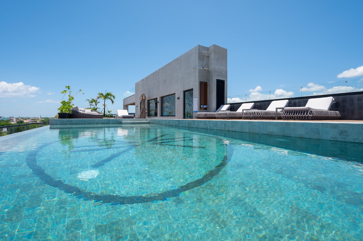 Flygt til vores luksuriøse lejlighed med 2 soveværelser i hjertet af Cozumel! Med en fantastisk balkon, et moderne opholdsområde og faciliteter af høj kvalitet er denne lejlighed det perfekte sted at slappe af og nyde øens ro. Slap af foran fladskærms-tv'et, spis ved det stilfulde bord for fire personer, eller tilbered dine egne måltider i det fuldt udstyrede køkken. Vores hyggelige soveværelser kan prale af queensize-senge, private terrasser og luksuriøst sengetøj til en fredelig nats søvn.