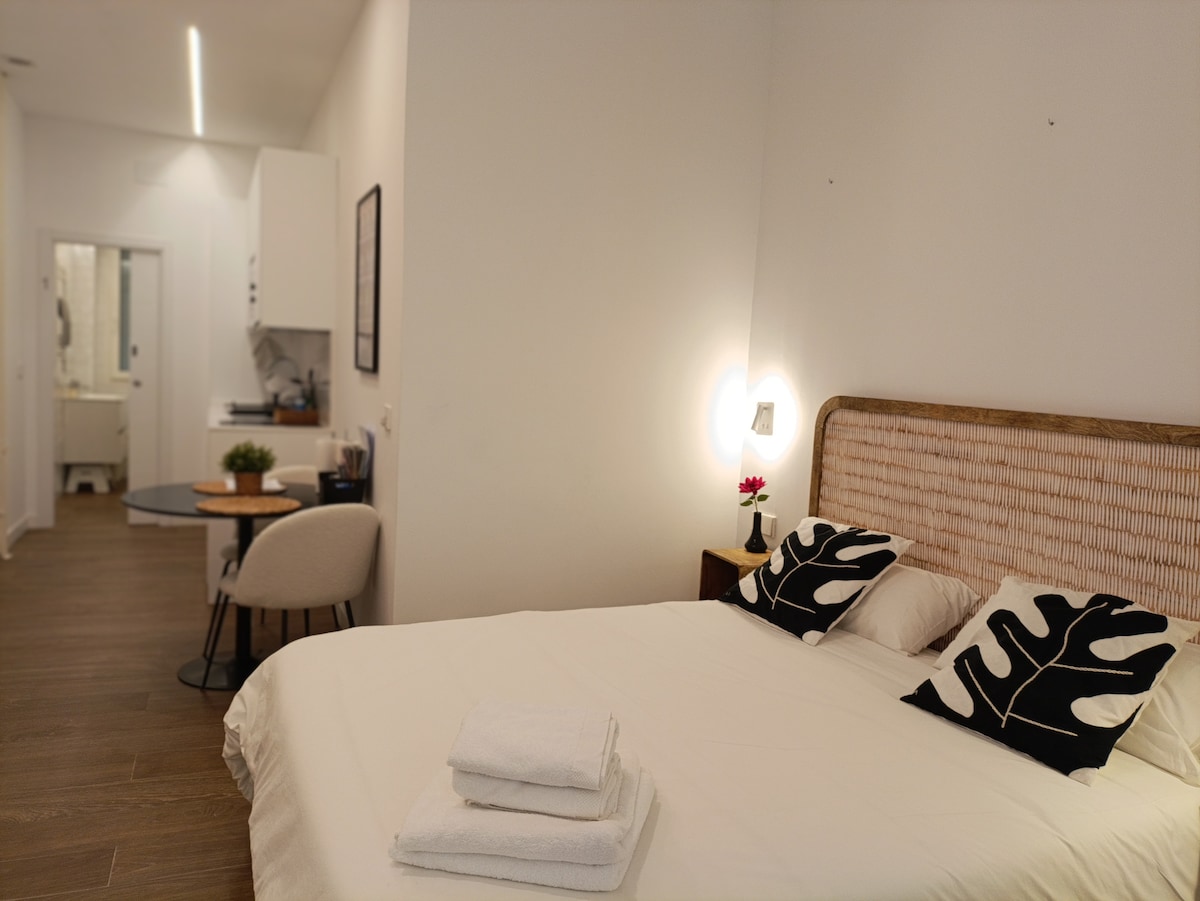 Spacious and bright studio located in Ciudad Lineal, a residential area of Madrid. Our studio will be perfect for business travellers. Fully equipped, a double bed is at your disposal. A washing machine and a hairdryer are also included. Sheets and towels will be provided. Boiler (not in the apt), heating by storage heaters and ducted a/ac. To find out more, please read the detailed description below. :)