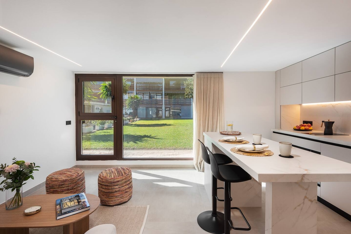 Chic lejlighed i stueetagen (50 m²), 2 soveværelser med eget badeværelse (soveplads til 3) i et lukket kompleks med have og pool, kun en kort gåtur fra San Pedros strand. Nomadevenlig: parkering, opladning af elbiler, fiberoptisk wi-fi, arbejdsområde, vaskemaskine/tørretumbler, rabatter på længerevarende ophold og gratis lufthavnstransport. Ved siden af Carrefour, park, hæveautomat, bus, tobaksbutik, hotel og klinik. 5-stjernet: fuldt udstyret køkken, bomuldslagner og håndklæder, faciliteter, babyseng, høj stol, omfattende rengøringsprotokoller, 5-stjernet Superhost.