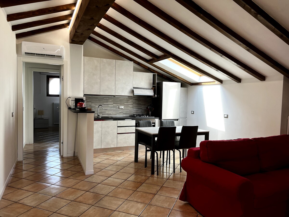 La Mansardina er et lille og hyggeligt sted, der er et romantisk fristed under træbjælker, perfekt til ferier og weekender for at opleve Motor Valley, ideel til familier og små grupper, der ønsker at udforske Modena og dens omgivelser. Udstyret køkken, komplet badeværelse og soveværelse med plads til 3. Ovenlys med myggenet, varme LED-lys og omhyggeligt udformede detaljer skaber en afslappende atmosfære. Beliggende på 3. sal uden elevator, i centrum af Rami di Ravarino, med en bar, bageri og butikker lige uden for huset.