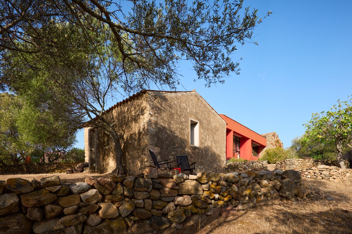 Nybygget hus på landet 2,5 km fra det smukke hav Capo Comino, men i naturens fred! Det er designet af hans EJER ARKITEKT efter bedste lave energi og BIOKLIMATISKE principper, der stadig respekterer lokale TYPISKE arkitektur. FAMILIEVENLIGE OG NATURELSKERE