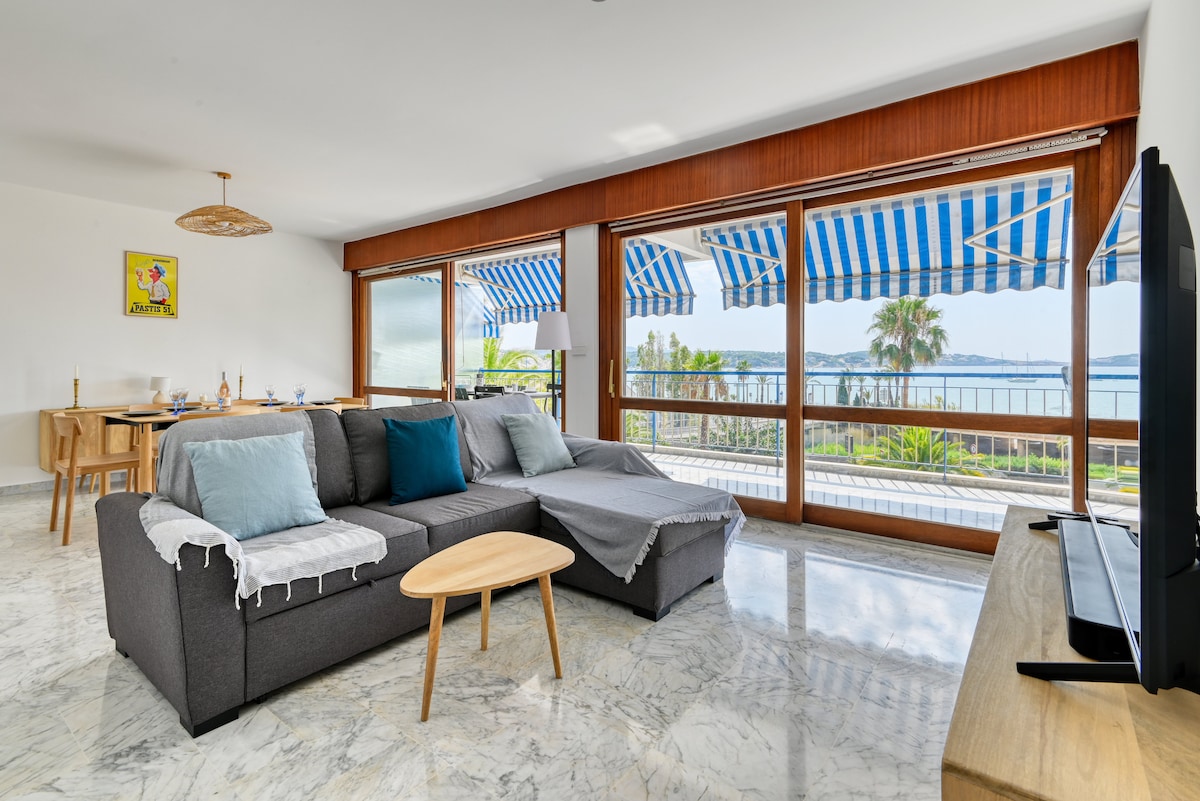 Bandol , Charmerende bolig ved havet, men sat tilbage fra vejen, eventyrlige havudsigt, stor terrasse ud mod havet, sandstrande i bunden af boligen, sikker parkering, WiFi. Aircondition Lejlighed klassificeret 3*, totalrenoveret med eksklusive tjenester til 2 personer (maks. 3) Glem bilen, og gør alt til fods; strande, butikker, restauranter Levende feriested selv om vinteren ; nyd solen til at slentre på terrassen foran en café eller cocktail