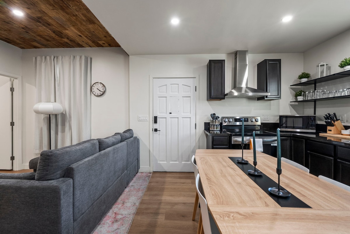 This 1-bedroom/1-bathroom house is 15-20min drive from Dodger Stadium. Built in the early 1940s, its decor is a nod to that era's timeless charm. Blackout drapes enhance the sleeping areas for a restful night's sleep. The beverage bar features ample cabinetry, an accent wall with backsplash, and unique open live edge shelves, crafted from the old avocado tree that once graced the patio. The patio has since been transformed with outdoor furniture, making it perfect for leisurely moments outdoors.