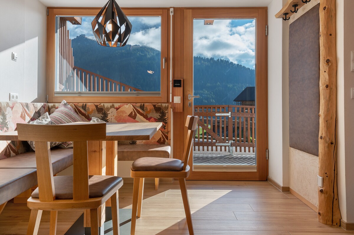 Vores lyse lejlighed er fuldt udstyret og har en privat sydvendt balkon med en unik udsigt. Takket være chaletens centrale beliggenhed kan du starte dine ferieaktiviteter om sommeren samt om vinteren direkte fra boligen til fods. Bagefter kan du forkæle dig selv med et par timers afslapning i den private sauna i din hytte eller afslutte dagen på sofaen med et glas vin og udsigt gennem vores panoramavinduer.