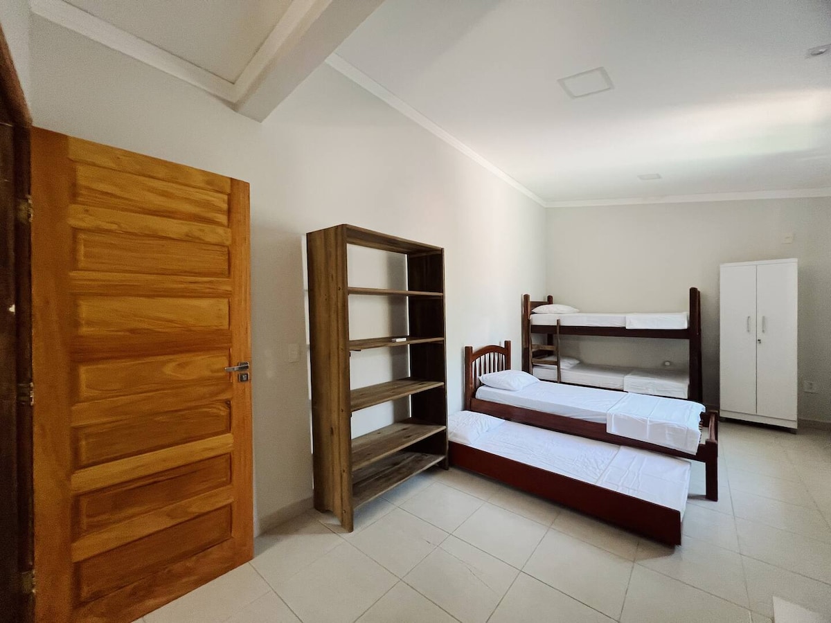 Alugo værelse/suite med: seks senge , loftsventilator, et udendørs område med badeværelse og balkon med netværksejere. Stort udendørs område. Det beløb, der vises, refererer til en nat for hver gæst, boligen har plads til op til seks personer, men der opkræves en nat per person. BEMÆRK: VI TILBYDER IKKE SENGETØJ OG SENGETØJ OG PERSONLIG HYGIEJNE OG RENGØRINGSPRODUKTER Slap af med hele familien i denne rolige bolig.