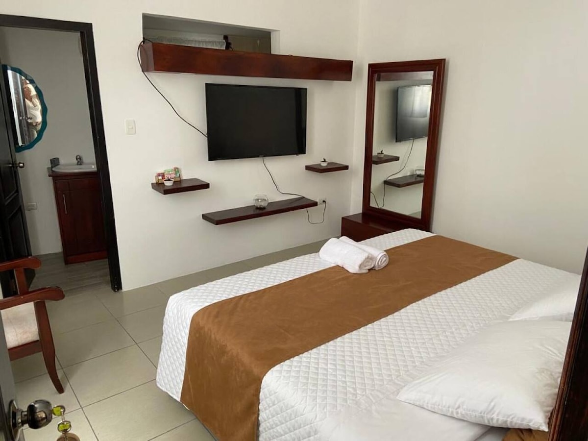 Du har en vidunderlig udsigt hele dagen, da du befinder dig på terrassen på en af øens højeste bygninger. Meget nem at finde på Baltra hovedgade. Omgivet af restauranter, butikker og en Banco Pichincha-hæveautomat på den anden side af gaden. Fire blokke fra Terminal Terrestre og tre blokke fra Mercado Municipal og busstoppested til landdistrikterne. Privatliv på din egen åbne terrasse udstyret med motionsudstyr, spisestue og køkken med redskaber. Perfekt til møder.