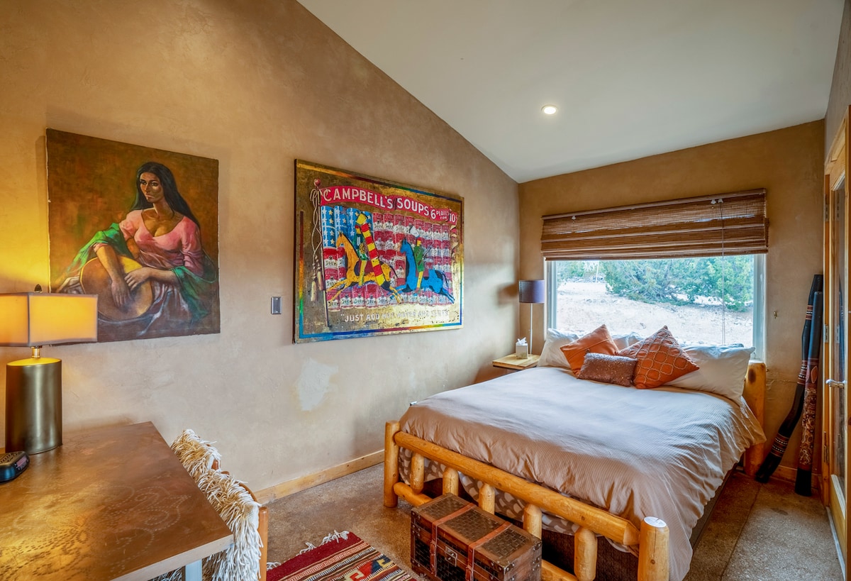 Unique, artistic, authentic adobe studio with flagstone floors, natural lighting, smooth plaster walls, viga ceilings, and original artwork throughout located in a tranquil setting North of Santa Fe off Hwy. US 84/285, accommodating up to 4 guest. Wide open spaces, panoramic mountain views, ample parking and only a 10 minute drive to the downtown Santa Fe plaza, minutes from the international renowned Santa Fe Opera, Tesuque Village Market, Four Seasons Resort and hiking trails.