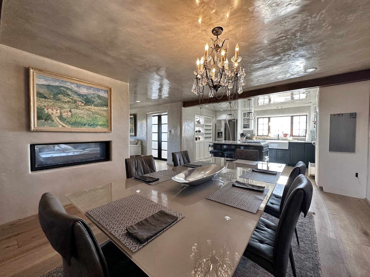 Welcome to a soulful 4-bedroom adobe retreat in Santa Fe's historic Agua Fría village — where traditional New Mexican architecture meets the warmth of an artist's home. Soak in the new private hot tub under open desert skies, gather around the firepit in the fully fenced courtyard, and settle into a home that 216 guests have called their favorite Santa Fe stay. Just 5 minutes from Meow Wolf and 15 minutes from the Plaza. Fully fenced and pet friendly, with parking for multiple vehicles.