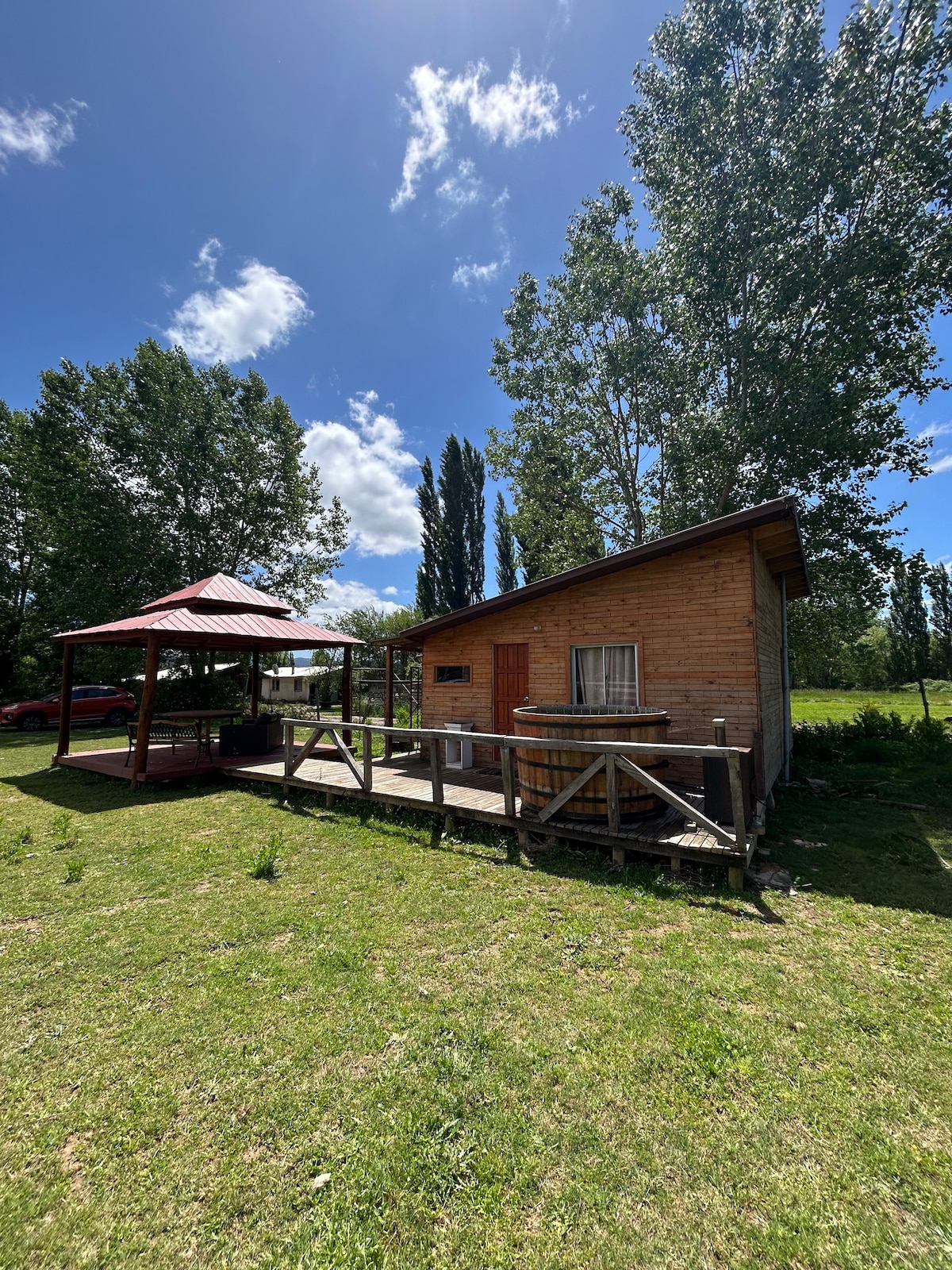 Jeg tilbyder dig et område på 2500 m2 med grønne områder, plads til grill og en bæk, hvor du kan køle af. Området er kun til dig, det deles ikke med andre gæster eller andre hytter. Huset er 50 m2, udstyret med alt, hvad du behøver for et behageligt ophold. Det ligger 300 meter fra motorvej 5 syd, på vej til Aguada med fremragende asfalteret adgang. Saltos del Laja vandfaldet ligger 2 minutter væk.