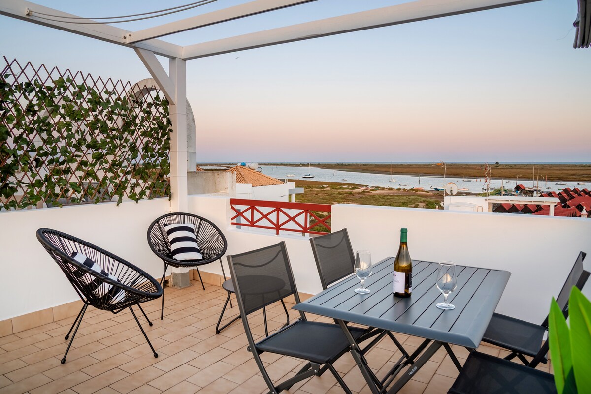 Vores øverste etage (2. sal) Frontline-lejlighed ligger i en førsteklasses beliggenhed ved vandet i den uberørte fiskerlandsby Santa Luzia. Vores rummelige private terrasse uden udsigt med indbygget grill har en fantastisk uafbrudt udsigt om dagen og fantastiske solnedgange om aftenen, og den er fantastisk placeret ved vandkanten af Ria Formosa. For din komfort er der airconditionenheder i soveværelset med 'King Size'-seng og stue til afkøling om sommeren og opvarmning til vinteraftenerne.