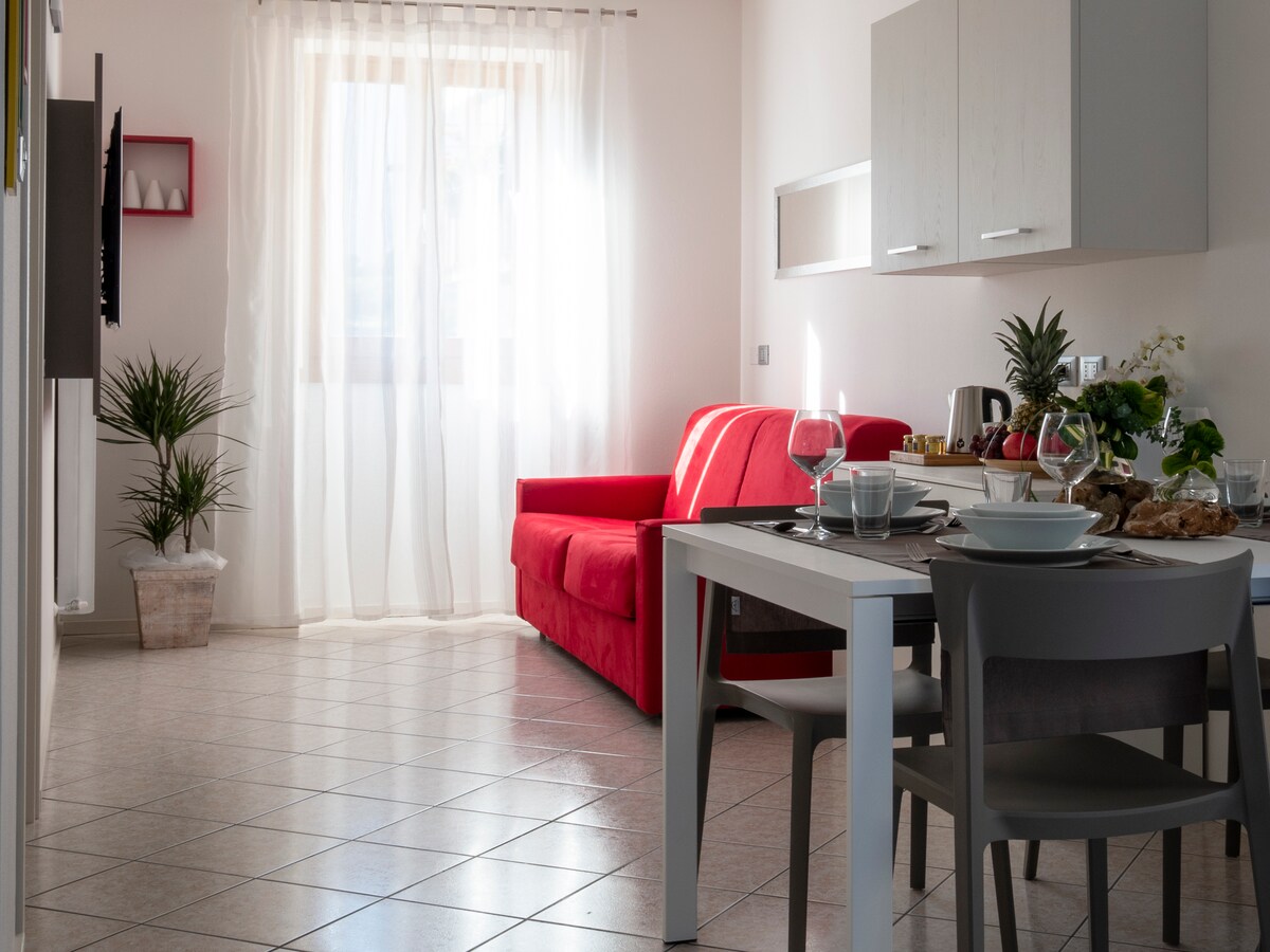 En stor lejlighed (mere end 80 kvm, med to soveværelser, to badeværelser, et komplet køkken og en stor stue med sovesofa), totalrenoveret og aldrig tilbudt før på platformene. Et roligt område (og stille selv om natten), men kun få minutters gang fra byens centrum. Forskellige typer af lokale butikker og supermarkeder er inden for rækkevidde, for nem shopping. To terrasser, hvor du også kan nyde udendørslivet. Dette (og mere) er Gios hus.