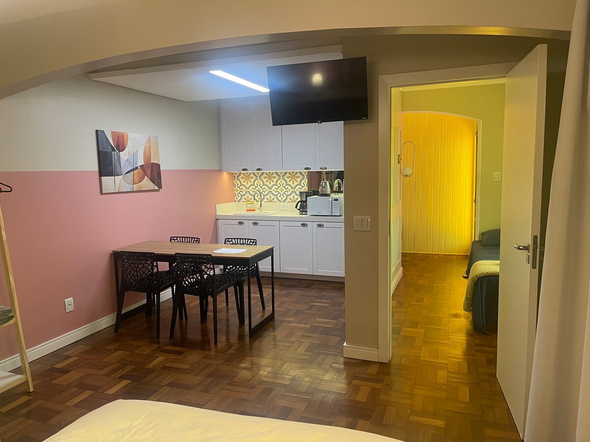 Moderne og hyggelig etværelses i centrum af Santa Rosa med aircondition, komfortabel dobbeltseng og stor sofa. Køkken udstyret med airfryer, kaffemaskine og redskaber samt basisting (salt, sukker, olie og krydderier). Vi tilbyder shampoo, balsam og sæbe. Den ligger på 2. sal (ingen elevator) og har en garage. Apotek foran, 1 blok fra forummet og posten, tæt på restauranter, butikker, marked (<500 m) og busstation (1 km). Hvis du har brug for noget særligt, er du velkommen til at kontakte os.