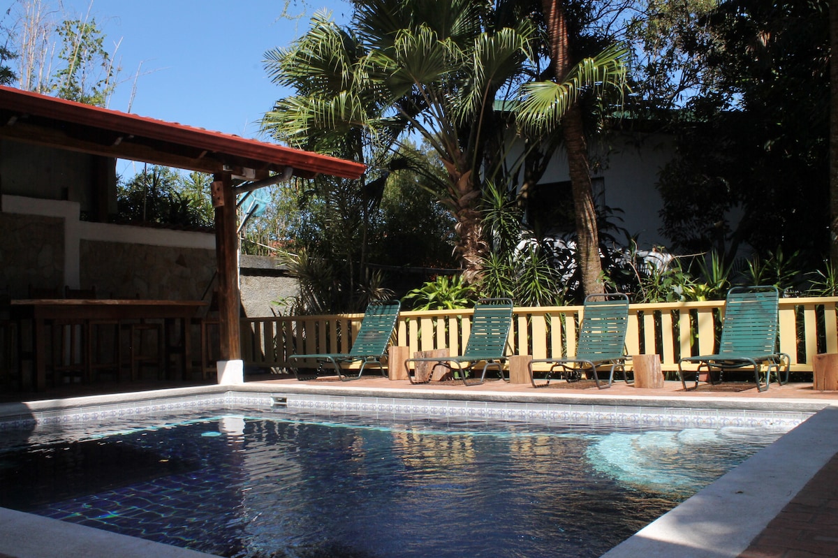 Lyst, rummeligt og komfortabelt værelse med en kingsize-seng og et tilstødende badeværelse med smuk, brugerdefineret costaricansk kunst, en stor kommode, elegant toiletbord og et rummeligt, forfriskende brusebad. Pålidelig wi-fi gør det nemt, hvilket gør det perfekt til at slappe af og holde kontakten efter spændende dage på stranden eller dage fyldt med eventyr. Din hyggelige, indbydende oase, hvor du virkelig kan slappe af og afslutte dagen med stil og komfort. Nyd det fælles fuldt udstyrede køkken, stuen, spisestuen, den tropiske udendørs have og poolen!