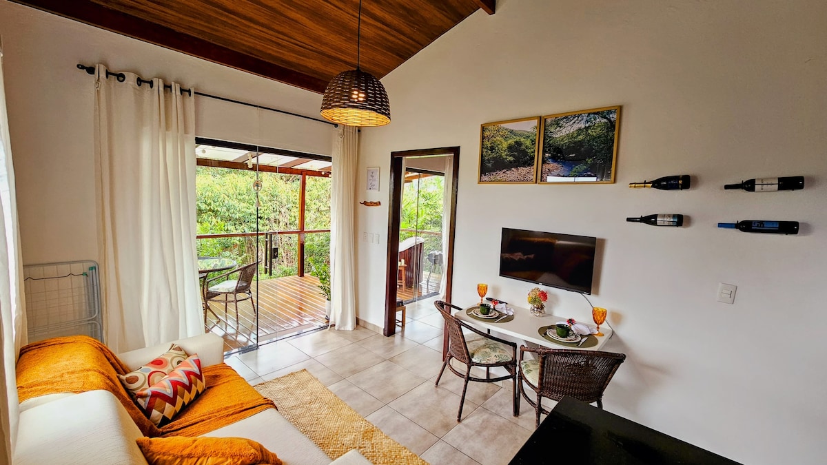 Ambiente sustentável totalmente integrado com a natureza e dedicado para o bem estar, conforto e experiências. Nosso bangalô é feito de materiais naturais, madeira e pedra. O seu clima aconchegante em meio às árvores, faz um convite para uma conexão muito próxima com a natureza. Cada detalhe é feito artesanalmente e pensado exatamente para o espaço aberto pela natureza, sem tirar nenhuma árvore. A ideia é que a natureza nos abrace e que estejamos em harmonia com o ambiente a nossa volta.