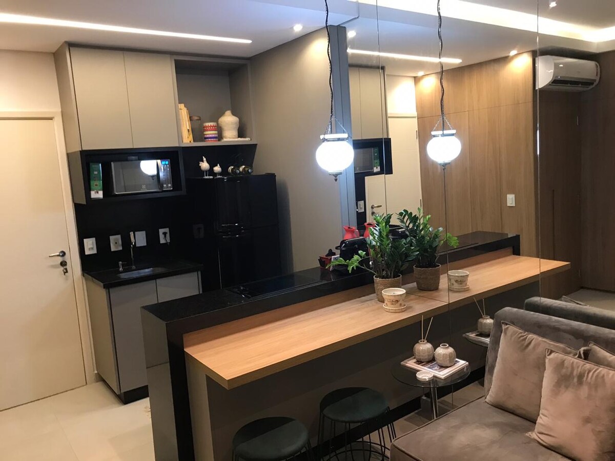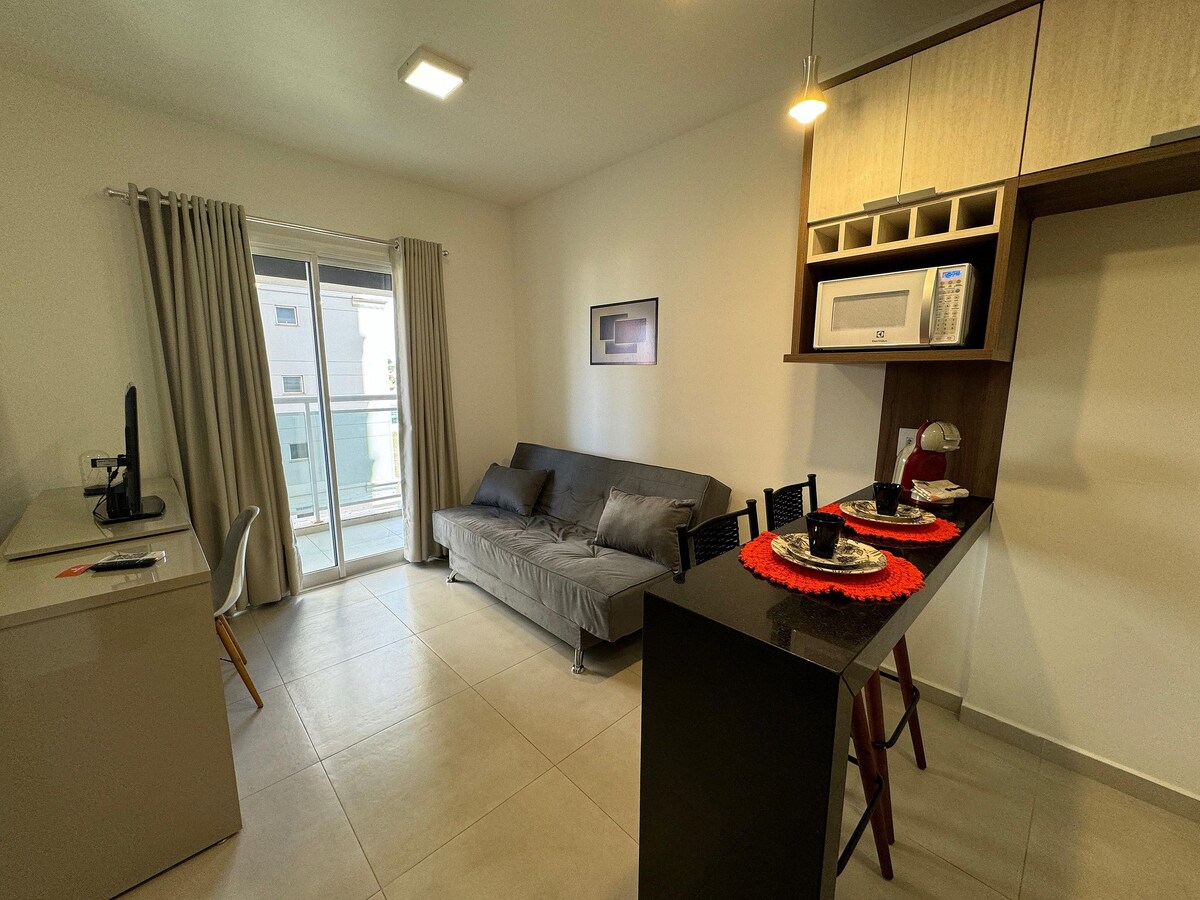 "Fuldt loft med plads til 4 personer, der er udstyret med køkkenredskaber, seng, bord, bad, alle tænkt på din facilitet. Tæt på Riopreto og Iguatemi indkøbscentre, universiteter (UNIP og FAMERP), supermarkeder og apoteker. I stueetagen er der et indkøbscenter med restauranter med italienske, japanske, argentinske, caféer og gelateria-restauranter. Fritids område med infinity pool, fitnessrum, jacuzzi, spillerum, vaskeri, studie eller mødelokale, parkering og 24-timers concierge.